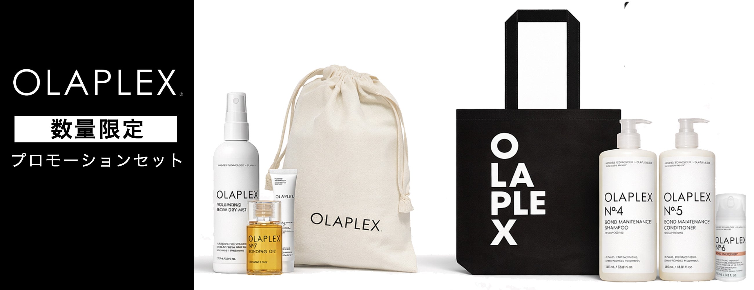 オラプレックスの人気アイテムであるNo.4ボンドメンテナンスシャンプー1,000mL、No.5ボンドメンテナンスコンディショナー1,000mL、No.6 ボンドスムーサー 100mLをセットでご購入いただいた方へ、ラッシュボンドビルディングセラム1本とオラプレックスロゴトートバッグをプレゼント。
