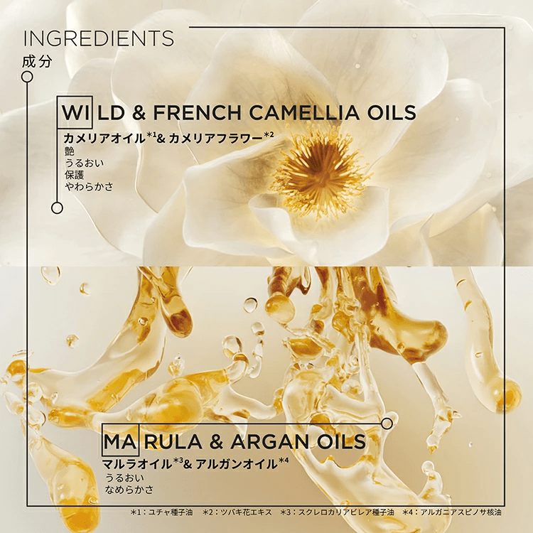 配合成分 | ●カメリアオイル*1(艶・うるおい)●マイズオイル*2(やわらかさ)●アルガンオイル*3(なめらかさ)●マルラ オイル*4(うるおい)●プラカシーオイル*5(ハリ・コシ感)●ツバキ花エキス(補修・保護・やわらかさ) ●アンマロク果実エキス(保護) *1:ユチャ種子油 *2:トウモロコシ胚芽油 *3 :アルガニアスピノサ核油 *4: スクレロカリアビレア種子油 *5:ペンタクレスラマクロロバ種子油 ※こちらの成分表示は一部成分となります。 ※商品の改良や表示方法の変更などにより、実際の成分と一部異なる場合があります。 実際の成分は商品の表示をご覧ください。 |
