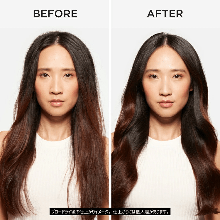 ドライヤーで根元をしっかりと乾かし、中間~毛先の順番で乾かしていきます。ドライヤーの熱で乾かすというより、風で水気を飛ばすイメージで。(毛先の乾かし過ぎに要注意。) |