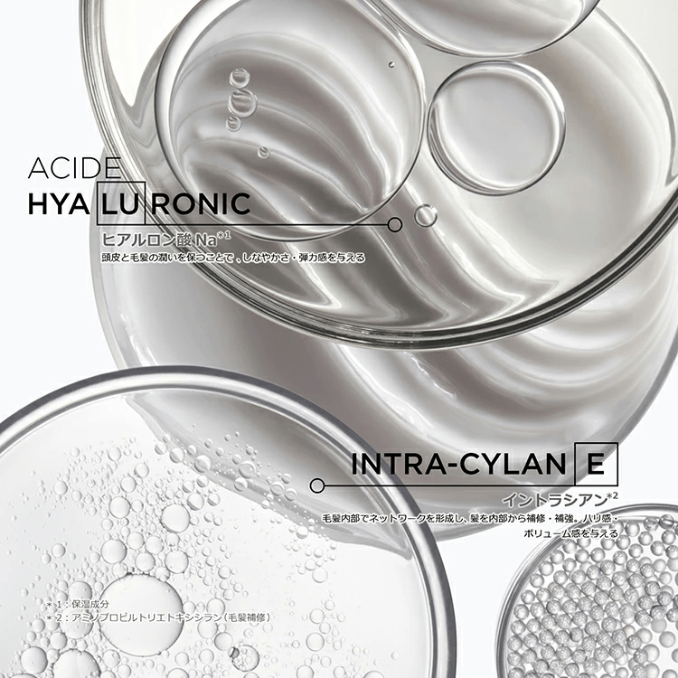 | 配合成分 | ●イントラシラン*1(毛髪補修・補強成分)●システム デンシファイング ーヒアルロン酸Na(保湿成分) サフラワーグルコシド(コンディショニング成分) ーセラミド*2(毛髪補修成分)*1:アミノプロピルトリエトキシシラン*2:オレアミドオクタデカンジオール |
