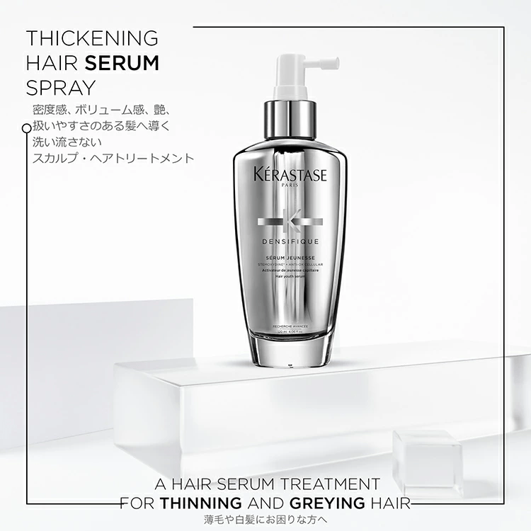 | 商品概要 | 密度感、ボリューム感、艶、扱いやすさのある髪へ導く 洗い流さないスカルプ・ヘアトリートメント ・白髪が気になってきた方 ・髪の密度感、ハリ、コシ、ボリューム感が気になる方 ・頭皮からエイジングケアをしたい方 |