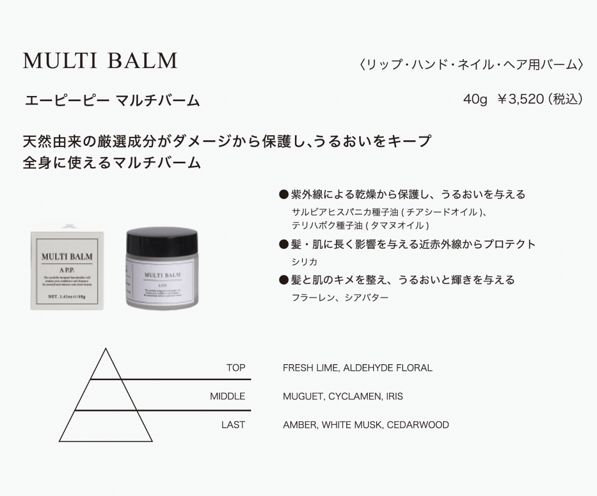 商品概要 | 天然由来の厳選成分がダメージから保護し、うるおいをキープ。 全身に使えるマルチバーム。 |