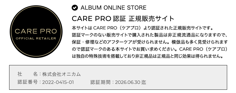 CARE PRO、CARE PRO のロゴ、CARE PRO DEEPは、日本、米国およびその他の国で登録された株式会社ベースメントファクトリーデザインの商標です。超浸透テクノロジー、エッセンシャルライトは株式会社ベースメントファクトリーデザインのトレードマークです。 TM and Copyright © 2022 Basement Factory Design Co., Ltd. All rights reserved.
