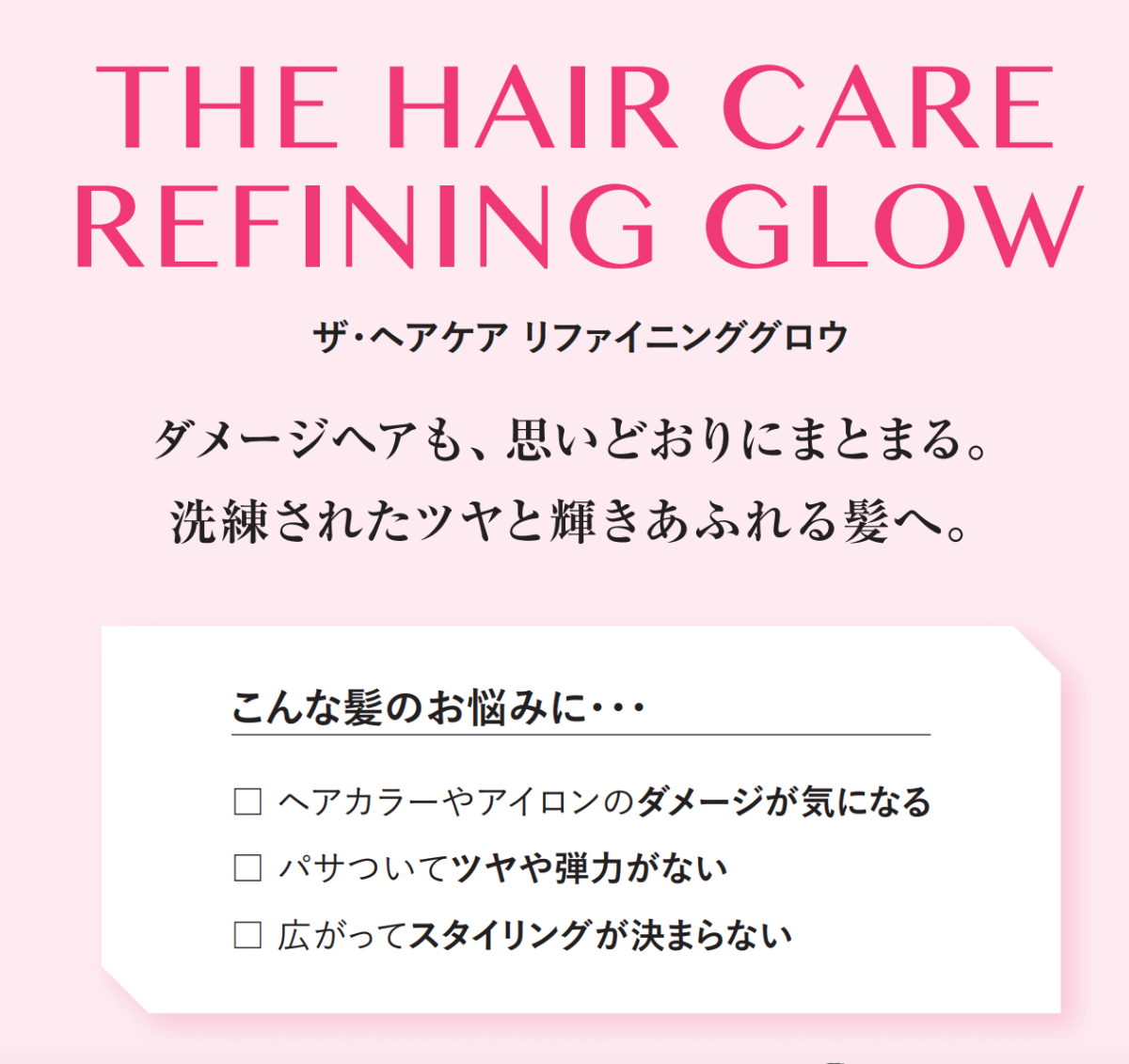 「リファイニンググロウ」は、日々のダメージで扱いにくくなった髪に、サロン帰りのような洗練されたツヤと輝きをもたらすダメージケアラインです。毛髪内部にうるおいを与え、やわらかな髪に導きながら、湿気から髪を守り、まとまりのある仕上がりを持続します。また、毛髪表面に皮膜を形成し、ダメージ部分を選択的に補修する「コンセントレートダメージケアテクノロジー」を搭載。ドライヤーやアイロンの熱を味方にしてダメージをケアし、さらなるダメージから髪をプロテクトします。