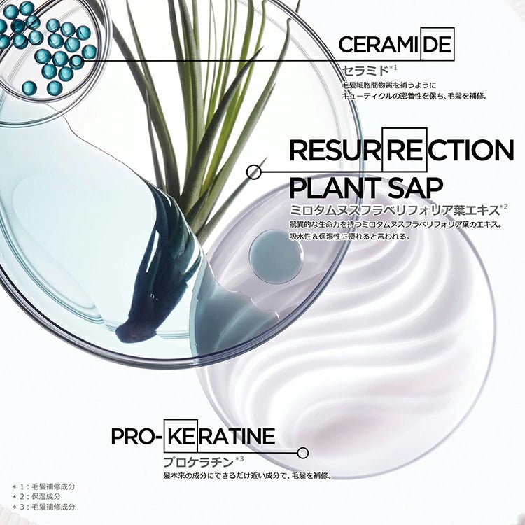 ぺたんとしやすい細い髪もふんわりボリューアップさせ、同時にダメージ補修を叶える、細い髪には最適なシャンプー。日常の外的ダメージやスタイリング、サロン施術によるダメージを補修・毛髪を強化し、未来のダメージまで予防します。やさしく不要な蓄積を取り除き、髪を清潔に、そして柔らかさと軽やかさを保ちながら、ハリ・コシ・弾むような美しさを実現します。