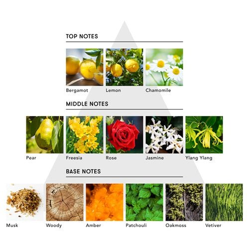 Top Note: レモン、ペアー (朝露に濡れた果実のような、みずみずしいフレッシュさが鼻をくすぐります)