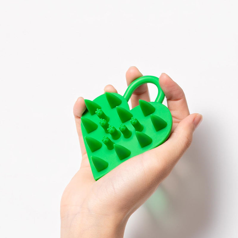 横幅約8cmのハート型は、手の中にすっぽりと収まり、シャンプー中の泡ついた手でも滑りにくい設計。 しっかり握り込めるので、力を入れやすく、男性の硬い頭皮もしっかりほぐせます。