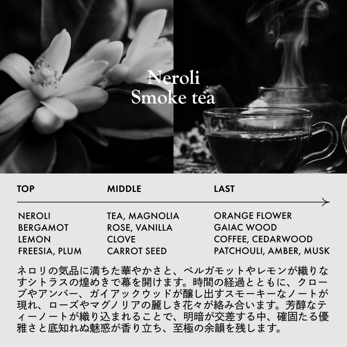 ネロリの気品に満ちた華やかさと、ベルガモットやレモソが織りなすジトラスの坦めきで幕を開けます。時間の経過とともに、クローブやアンバー、ガイアックウッドが醸し出すスモーキーなノートが現れ、ローズやマグノリアの麗しき花々が絡み合います。芳醇なティーノートが織り込まれることで、明暗が交差する中、確固たる侵雅さと底知れぬ魅惑が香り立ち、至極の余韻を残します。